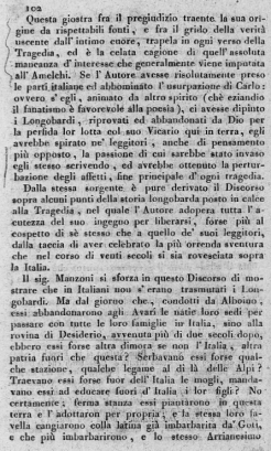 Ma d'altra parte il generoso spirto che alberga nelle membra all'autore del Conte di Carmagnola non poteva, a malgrado della preoccupata sua mente, non trarlo a sentire quanto lagrimevole fosse riuscita all'Italia l'estinzione del regno longobardo e la vittoria di Carlo.