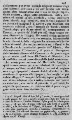 Lo stesso pure avvenne de' Mori della Spagna, i quali conservarono perpetue relazioni di amicizia e di sangue co' Saraceni dell'Affrica, nè mai si congiunsero cogli Spagnuoli, rimasti fedeli al culto del Dio crocifisso. E quanto alla Spagna, ben meglio si potrebbe allegare l'esempio de' Goti, i quali professando una stessa religione che i natii, talmente con loro si mescolarono, che ancor al presente le più nobili famiglie di quel reame si vantano che il puro sangue goto nelle vene loro discorra (I).