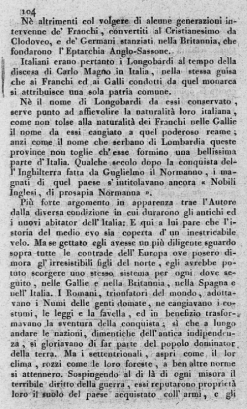 Nè il nome di Longobardi da essi conservato, serve punto ad affievolire la naturalità loro italiana, come non tolse alla naturalità dei Franchi nelle Gallie il nome da essi cangiato a quel poderoso reame; anzi come il nome che serbano di Lombardia queste province non toglie ch'esse formino una bellissima parte d'Italia. Qualche secolo dopo la conquista dell'Inghilterra fatta da Guglielmo il Normanno, i magnati di quel paese s'intitolavano ancora "Nobili Inglesi, di prosapia Normanna".