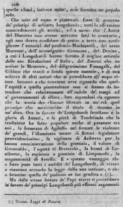 (I) "La successione de' re Longobardi, dice il Gibbon, si contraddistinse per abilità e per valore. La turbata serie dei loro anni è adorna di grandi intervalli di pace, di ordine, di domestica felicità, e gl'Italiani godettero un più mite e più equo governo, che non verun altro de' regni fondati sulle rovine dell'Impero Occidentale".