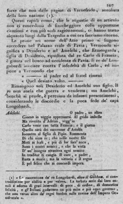 Le opinioni manifestate dal sig. Manzoni nell'impresa da lui tentata di confutare il Sismondi, inducevano gli ammiratori del suo poetico ingegno a temere, che trattando egli, come ne suonava il grido, la caduta de' Longobardi in tragedia, appigliar non si volesse al partito più contrario alla verità istorici ed alla rettitudine dei giudizj che la poesia dee inspirare nel popolo. Imperciocchè, infetta esser doveva a' suoi occhi d'un incancellabil peccato la generazione de Longobardi, come quelli che volendo in un solo dominio ridurre l'Italia, acremente aveano contrastato l'ingrandimento temporale de' Papi, e tirato quindi sopra di se il loro odio (I). Ed avverato con grande loro rincrescimento fu quel timore.