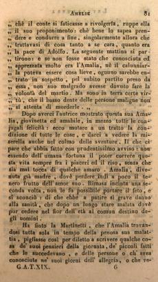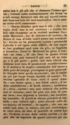 Questo biasimo però non è tale, che non voglia anch'esso la sua eccezione: e sembra infatti che vivamente ce la reclami madama Cornelia Martinetti, fior di dottrina e di cortesia, in favore di cosa sì bella com'è questo suo romanzetto. Ed ella ne ha pienamente ragione: perciocchè l'Amalia è un'opera delle siffatte, da non sapersi ben giudicare qual cosa sia più, se leggiadra o istruttiva. Certo la Martinetti ha preso a trattare un tema, di che forse in questo vivere umano non può trovarsi il più caro ad un tempo e il più grave: quello cioè della felicità che debbono aver cura di procacciarsi scambievolmente il marito e la moglie: essendochè dall'amore e dalla pace de' conjugi provengano in gran parte nelle famiglie tutte quelle beatitudini, che le rendono poi per lungo tempo durabili ed onorate. Verissimo specchio di tutte virtù è quest'Amalia: una tenera sposa, una fedele amica, d'indole amabilissima, di bontà sincera, caritatevole, savia, cortese: non così tuttavia che subito non si conosca, esser lei pure una cosa di questa terra; rara alquanto a trovarsi, ma nondimeno trovabile. E perciò se alcuno prenderà ad imitarla, non imiterà egli, come succede nelle altre fantasie de romanzi, un oggetto, che non essendo mai stato in natura, non può assolutamente esser altro ch'oltre al possibile di nostre forze. Prudente avviso della nobile autrice, e degno che sia seguitato da quanti scrivono per comune ammaestramento: perciocchè ognuno ha sortito al mondo un suo luogo particolare: oltre al quale non è più stato felice, perchè non è più natura. Gli angeli, diceva un buon filosofo a certo accigliato censore, non sono altro che angeli: siccome i diavoli non sono che diavoli, e uomini gli uomini.