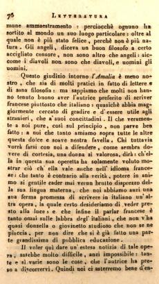 Questo giudizio intorno l'Amalia è meno nostro, che sia di molti pratici in fatto di lettere e di sana filosofia: ma sappiamo che molti non hanno tenuto buono aver l'autrice preferito di scriver francese piuttosto che italiano: quasichè abbia maggiormente cercato di gradire e d'essere utile agli stranieri, che a' suoi concittadini. Il che veramente a noi pure, così sul principio, non parve ben fatto: a noi che tanto amiamo sopra tutte le altre questa dolce e soave nostra favella. Chi tuttavia vorrà farsi con noi a difendere, come sembra dovere di cortesia, una donna sì valorosa, dirà: ch'ella in questa sua operetta ha solamente voluto mostrar ciò ch'ella vale anche nell'idioma francese: che tanto è contrario alla verità, potere in animo sì gentile cader mai verun brutto disprezzo della sua lingua materna, che noi abbiamo anzi una sua ferma promessa di scrivere in italiano un'altra opera, la quale certo desideriamo di veder presto alla luce: e che infine il parlar francese è tanto omai sulle labbra degl'italiani, che non v'ha quasi donzella o giovinetto studioso che non se ne piaccia, per non dire che si è già fatto una parte grandissima di pubblica educazione.