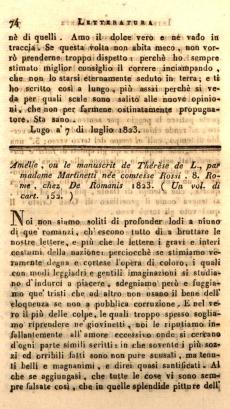 Amélie, ou le manuscrit de Thérèse de L., par madame Martinetti née comtesse Rossi. 8. Rome, chez De Romanis 1823. (Un vol. di cart. 152.)
