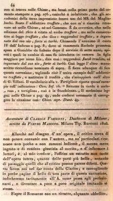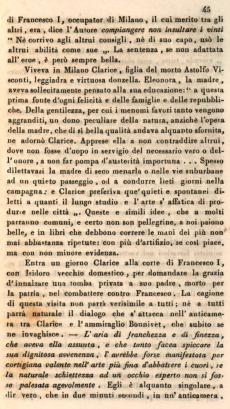 Viveva in Milano Clarice, figlia del morto Astolfo Visconti, leggiadra e virtuosa donzella. Eleonora, la madre, aveva sollecitamente pensato alla sua educazione: "a questa prima fonte d'ogni felicità e delle famiglie e delle repubbliche. Della gentilezza, per cui i menomi favori tanto vengono aggranditi, un dono peculiare della natura, anziché l'opera della madre, che di sì bella qualità andava alquanto sfornita, ne adornò Clarice. Apprese ella a non contraddire altrui, dove non fosse d'uopo in servigio del necessario vero o dell'onore, a non far pompa d'austerità importuna . . . Spesso dilettavasi la madre di seco menarla o nelle vie suburbane ad un quieto passeggio, od a condurre lieti giorni nella campagna: e Clarice preferiva que' quieti e spontanei diletti a quanti il lungo studio e l'arte s'affatica di produrre nelle città". Queste e simili idee, che a molti parranno comuni, e certo non son pellegrine, a noi paiono belle, e in libri che debbono correre le mani dei più non mai abbastanza ripetute: con più d'artifizio, se così piace, ma con non minore evidenza.