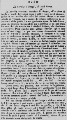 La novella veneziana intitolata il Beppo, ch'è piena di lunghe e inutili digressioni sopra i cattivi poeti ed il divorzio, finisce in una maniera che sente del comico. Beppo è un mercadante di Venezia, cui i rovesci di fortuna obbligarono ad allontanarsi dalla patria. La sua giovinetta sposa, la bella Laura, parve da principio inconsolabile per la partenza di lui, ma grazie alle cure del più amabile fra i cavalieri italiani, ella finalmente si racconsolò. Dopo qualche anno Beppo ritorna: egli si fece turco ne' suoi viaggi, e per non essere riconosciuto conserva anche in Venezia il costume orientale. Il turbante e la lunga veste lo trasformano in modo agli occhi de' suoi conoscenti, che niuno il ravvisa, nè meno Laura, la quale trovandosi ad una festa da ballo col servente, era stata da lui lungamente guardata e seguita. Vicina l'ora del mattino gli amanti si ritirarono, ma quando la loro gondola toccò la riva davanti la casa di Laura essi rimasero stupefatti veggendosi colà l'inevitabil turco... Signore, gli dice il cavaliere aggrottando le ciglia, la vostra presenza non aspettata mi obbligherà di chiedervi per qual motivo seguitiate i nostri passi: amo di credere che ciò provenga da qualche sbaglio. — Signore, risponde il Turco, non è questo uno sbaglio, la donna ch'è con voi è mia moglie. — Laura non disse una parola: che poteva ella dire?... ma il cavaliere invitò con molto garbo lo straniero ad entrare nella casa, ed il maomettano tenne l'invito con una dolcezza veramente cristiana. Laura frattanto, riavutasi dalla sorpresa e rassicurata, Beppo, Beppo, gridò, eh! qual è dunque il vostro nome pagano?... Oh! quanto si è allungata la vostra barba! Perchè fare una così lunga assenza?... Sapete voi che ciò non va bene?... È vero che i turchi mangiano con le dita?... Oh, mio Dio!... che bellissimo schall avete là; io spero che tu me ne farai un regalo.