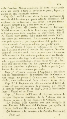 Cap. 6.° Muore il padre di Caterina, ed ella recatasi a Milano si pose al servizio del capitano Vacallo, uomo di trentatre anni, che a poco a poco s'innamorò della cameriera. Ma confidato questo caso ad un Omati, uomo secolare che leggeva il Delrio, ed aveva molto zelo e poca mansuetudine, questo nuovo teologo, fondato sull'impossibilità che un capitano s'innamorasse delle sua cameriera (giovinetta, bella e gentile) affermò che ciò era avvenuto per malia.
