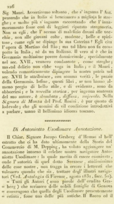 Qui lasciamo e la Caterina e la Novella Storica del Sig. Mauri. Avvertiremo soltanto, che s'inganna l'Aut. pensando che in Italia si bruciassero a migliaja le streghe; e molto più s'inganna raccontando che l'innamoramento fosse così di leggieri riputato stregoneria. Non sa egli, che l'accusa di malefizio davasi alle vecchie, non alle giovani colte, modeste, belle e spiritose, come egli ne dipinge la sua Caterina? Egli cita l'opera di Martino del Rio; ma tal libro non fu composto in Italia, nè da un Italiano. Il vero si è che in Germania moltissime povere donnicciuole, specialmente nel sec. XVII, vennero condannate, come streghe; ma tal delirio non ebbe voga in Italia; e il Mauri, volendo romanticamente dipingere la nostra patria nel sec. XVII le attribuisce, con somma verità, le pazzie della Germania. Infine, questi libri, se non hanno almeno pregio di bello stile, e di evidenza, sono da abborrirsi; e la novella storica, per ingenua sentenza del suo autore, è slombata, diffusa, nojevole. Nella Signora di Monza del Prof. Rosini, è pur questo di lodevole; che gli uomini di vil condizione introdottivi a parlare, usano il bellissimo idioma toscano.