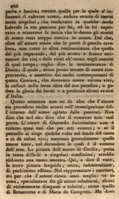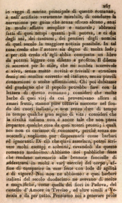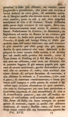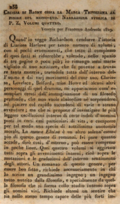 Quand'io veggo Richardson condurre l'istoria di Clarissa Harlove per tanto numero di volumi, con sì pochi avvenimenti, che tutto il complesso di quei fatti si ridurrebbe, volendo, nello spazio di tre pagine o poco più; io rimango assai maravigliato di uno scrittore, che fu potente a trovare tanta materia, traendola tutta dall'interno dell'uomo e dai vari movimenti del cuor suo. Clarissa, Lovelace, Belford, miss Howe ed alcuni altri personaggi di quel dramma, mi appariscono com'esemplari creati dall'immaginazione di un filosofo profondo, che non vuole sbalordire nè sorprendere nè piacere col rapido succedersi di varie e strane avventure; ma che si propone d'investigare le più leggere oscillazioni interne di certe indoli d'uomini posti in certi casi particolari di vita, e comporre per tal modo una specie di sottilissima anotomia morale. La nuova Eloisa è un altro solenn'esempio di questo genere di romanzi. Ivi pure quanto accade, dirò così, d'esterno, può essere compreso in poche linee. Quei quattro volumi si aggirano tutti sopra gli avvenimenti interni, cioè sopra le mutazioni e le gradazioni dell'interno sentimento degli attori. Un romanzo di questo genere, per essere ben fatto, richiede necessariamente in chi lo scrive un grandissimo ingegno; un ingegno tutto nutrito dalla filosofia, e specialmente da quella filosofia che si forma collo studio intenso sopra gli uomini vivi. Richiede altresì un sentire che sia nello stesso tempo capace delle più forti impressioni e delle più dilicate; un sentire tanto pieghevole e prontissimo, che possa con facilità e verità mutarsi in varie guise, ed assumere secondo il bisogno quelle che devono avere i tali o tali altri uomini, posti in tali o tali altre singolari condizioni di vita e di fortuna. Tanta difficoltà dalla parte degli scrittori di tali opere, deve rendere necessariamente assai scarso il numero dei buoni. Nulladimeno in Francia, in Germania, in Inghilterra ed anche in Russia se ne contano più che alcuni. In Italia non potrei nominare che Ugo Foscolo, il quale nel Jacopo Ortis, ci diede pur qualche cosa dell'uomo interiore: ma quel romanzo è più notabile per altri pregi che per questo. Anche di quei romanzi che sono destinati a dipingere lo stato attuale della società e ad istruire per tal modo nella pratica del mondo, come il Tom Jones di Fielding ed il Gil Blas di Le Sage, noi non ne abbiamo, cioè non ne abbiamo che si possano leggere. E già nessun popolo può sperare di averne moltissimi, perchè domandano scrittori che si trovano di rado; cioè scrittori che sieno dotati di un'arte finissima di osservare, e che abbiano la volontà e l'occasione, (che non è poco) di osservare continuamente; e tanta potenza nell'ingegno e nella penna da notare e far vedere ogni minima sfumatezza in quei caratteri, che non si distinguono per una loro particolare e fortissima impronta di casi straordinarj di vita o di straordinarie passioni, ma che all'occhio comune si confondono nell'universale degli uomini. Chi desse all'Italia un buon esempio in questo genere di romanzi, oppur in quello che abbiamo nominato di sopra; farebbe certo all'Italia un dono tanto nuovo alla sua letterattura, quanto degnissimo di essere lodato assai ed assai accarezzato.
