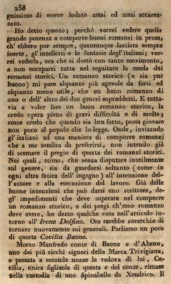 Ho detto questo; perchè vorrei vedere quella grande potenza a comporre buoni romanzi in prosa, ch'ebbero pur sempre, quantunque lasciata sempre inerte, gl'intelletti e le fantasie degl'italiani; vorrei vederla, ora che si destò con tanto movimento, a non occuparsi tutta nel seguitare la moda dei romanzi storici. Un romanzo storico (e sia pur buono) mi pare alquanto più agevole da farsi ed alquanto meno utile, che un buon romanzo di uno o dell'altro dei due generi sopraddetti. E tuttavia a voler fare un buon romanzo storico, la credo opera piena di gravi difficoltà e di molte; come credo che quando sia ben fatto, possa giovare non poco al popolo che lo legge. Onde, invitando gli italiani ad una maniera di comporre romanzi che a me sembra da preferirsi, non intendo già di scemare il pregio di questa dei romanzi storici. Nei quali, stimo, che senza disputare inutilmente sul genere, sia da guardarsi soltanto (come in ogni altra fatica dell'ingegno) all'intenzione dell'autore e alla esecuzione del lavoro. Già delle buone intenzioni che può darsi uno scrittore, degl'impedimenti che deve superare nel comporre un romanzo storico, e dei pregi ch'esso romanzo deve avere, ho detto qualche cosa nell'articolo intorno all'Irene Delfino. Ora sarebbe soverchio di tornare nuovamente sui generali. Parliamo un poco di questa Cecilia Baone.