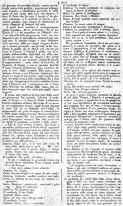 Carlo IX salito in trono all'età d'undici anni, palesava fin d'allora una tale inclinazione per le battaglie che facea presagire quanto poco sarebbe avaro di sangue. A 17 anni, pugnando contro gli Ugonotti, egli traversava la Francia dai Pirenei sino a Parigi, dicendo al corpo di Svizzeri che lo seguiva: Combattiamo sino all'estremo; voglio morire re e libero in mezzo a voi piuttosto che essere prigione. Con sì magnanimo coraggio egli malgrado la sua violenza sarebbe stato un eroe, se l'educazione ricevuta da Caterina sua madre e dal maresciallo di Betz, non l'avesse reso bassamente astuto. – Che terribile carattere sia quello di Caterina de' Medici non occorre rammentarlo. Sublime è la prima comparsa ch'ella fa in questa tragedia quando venendo ad accogliere l'ammiraglio Colignì, capo dei protestanti, coi quali i cattolici hanno fatto tregua, ella dice sotto voce al cardinale di Lorena: Lusinghiamo i nostri nemici; non leggano nel nostro cuore; questo giorno vedrà la pace; la prossima notte vedrà il loro sterminio. Questa donna sì padrona di se stessa e del re suo figlio, sì artificiosa nel giustificare tutta la sua iniquità coi principj del macchiavellismo, questa spaventevole eroina della perfidia, quantunque primeggi nella tragedia, è nondimeno governata in certo modo da due animi forti della sua tempra; il duca di Guisa che ha tutta l'energia d'un giovane ambizioso, e il cardinale di Lorena, che, maturo politico, finge sempre di dimenticare se stesso allegando gl'interessi del cielo.
