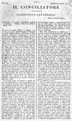 Molte altre osservazioni mi cadrebbe qui in acconcio di fare intorno alla diversità delle leggi con cui si hanno a comporre le tragedie della prima e della seconda specie indicate. Ma per non uscire dal divisamento propostomi di parlare del Carlo IX di Chénier, soggiungerò soltanto che sebbene le tragedie della prima specie possano anche essere sommamente efficaci per ispirare l'amore della virtù e la compassione che meritano le umane sciagure, nondimeno la più istruttiva, la più efficace, la più filosofica delle tragedie ci sembra essere la storica; e per istorica non intendiamo quella che ci rammenta senza pro alcuni fatti d'antichissimi annali, ma quella che ci parla sovra tutto de' nostri avi, delle nostre glorie nazionali e dei memorabili delitti onde queste furono contaminate. Vera istruzione si è dessa. Il volgo che non ha tempo di leggere impara ivi i fasti paterni, e gl'ingegni pensanti essendo dallo spettacolo d'un'azione più fortemente scossi che dalla lettura d'un libro, raffinano le loro meditazioni sulle vicende de' mortali, e ne derivano maggior giustezza di critica ed energia di sentimento nella sociale condotta.