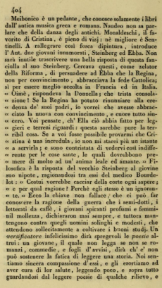 Meibonico è un pedante, che conosce solamente i libri dall'antica musica greca e romana. Naudeo non sa parlare che della danza degli antichi. Monaldeschi, il favorito di Cristina, è pieno di vizj: né migliore è Sentinelli. A rallegrare così fosca dipintura, introduce l'Aut. due giovani innamorati, Steinberg ed Ebba. Non sarà inutile trascrivere una bella risposta di questa fanciulla al suo Steinberg. Cercava questi, come zelator della Riforma, di persuadere ad Ebba che la Regina, non per convincimento, abbracciava la fede Cattolica; sì per essere meglio accolta in Francia ed in Italia. "Oimè, rispondeva la Donzella; che trista consolazione! Se la Regina ha potuto rinunziare alla credenza de' suoi padri, io vorrei che avesse abbracciato la nuova con convincimento, e cuore tutto sincero. Voi pensate, ch'Ella ciò abbia fatto per leggieri e terreni riguardi: questa sarebbe pure la terribil cosa. Se a voi fosse possibile provarmi che Cristina è una incredula, io non mi starei più un istante a servirla; e sono contristata di vedervi così indifferente per le cose sante, le quali dovrebbono premere di molto ad un'anima leale ed amante." Filosofica è la risposta del vecchio Steinberg al giovine suo nipote, ragionandosi tra essi del medico Bourdelot: "Costui vorrebbe cacciar della corte ogni sapere; e per qual ragione? Perché egli stesso è un ignorante." Ecco la chiave non fallace, che ci può far conoscere la ragione della guerra che i semi-dotti, i letterati da caffè, i giovani spiranti profumi e femminil mollezza, dichiararon mai sempre, e tuttora mantengono contra quegli uomini solinghi e modesti, che attendono sollecitamente a coltivare i buoni studj. Un versificatore infelicissimo dirà spregevoli le poesie altrui: un giovane, il quale non legga se non se romanzi, commedie, e fogli d'avvisi, dirà ch'e' non può sostenere la fatica di leggere una storia. Noi sentiamo sincera compassione d'essi, e gli esortiamo ad aver cura di lor salute, leggendo poco, e sopra tutto guardandosi dal leggere poesie di qualche rilievo, e volumi di storie diligenti ed esatte; ché alla fin fine son prette pedanterie. L'Almanacco delle Dame è più gradevole lettura, e non pute di lucerna.