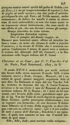 Il secolo XVIII è memorabile per molti scrittori che fecero della storia romanzi. Il secolo XIX è tutto romanzi storici; Scott, Cooper, Manzoni, ed i satelliti di questi pianeti maggiori acquistano fede al mio dire. La Germania si vanta del suo Van der Velde, tradotto in francese dal sig. A. Loève-Veimars. Cristina e la sua Corte è uno de' Romanzi di questo scrittore tedesco. Né la Regina, né i dotti da lei trattenuti, né i favoriti della corte, potrebbero saper grado al sig. Van der Velde di averli dipinti in questo suo libro. Cristina, quella principessa celebratissima, non sa regnare con fermezza, né con decenza. Il dottissimo Salmasio sa il nome della seggiola in dieci lingue; ma non sa sedervisi sopra: egli è il più erudito di tutti i pazzi dell'Europa, Bourdelot è un epicureo, il quale non ammette se non che l'orribil dottrina di quel verso:
