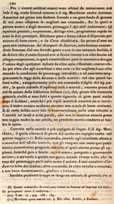 Fra i viventi scrittori comici sono altresì da menzionare con lode il sig. conte Giraud romano e il sig. Marchisio anche torinese. Ammirasi nel primo una fantasia feconda e un gran fondo di gaiezza di cui sono cosperse le migliori sue commedie, fra le quali a parere nostro e degli stranieri, primeggia l'Ajo nell'imbarazzo: (9) equivoci graziosi, sospensione, dialogo vivo, progressione rapida ne sono le doti principali. Dilettano pure e fanno ridere il Disperato per eccesso di buon cuore, e la Casa disabitata. La prima d'esse ne pare una imitazione del désespoir de Jocrisse, antichissima commediola francese. Col suo fervido genio e con la sua naturale facilità, è da dolere che il conte Giraud non si faccia innanzi con altre buone ed allegre composizioni, le quali riuscirebbero pure in acconcio a divagar l'animo degli spettatori italiani da altre serie riflessioni; converrebbe per altro che egli avvertisse a due cose: a far migliore il suo stile secondo la condizione de' personaggi introdotti; e ad osservare maggiormente le leggi della decenza e della morale: nel che peccò taluna volta, e singolarmente nella sua commedia il figlio del sig. padre, la quale ridonda d'equivoci laidi e scurrili, siccome prima di noi fu notato dalla biblioteca italiana (10); ché, grazie alla crescente generale civiltà si sono fatti a questo riguardo di gran passi anche dopo il Goldoni; cosicché i più rigidi moralisti cominciano a ravvisare il teatro comico moderno siccome una scuola di buon costume. E di certo debbe esser tale la convenevolezza nelle cose ritratte e l'onestà ne' modi e nelle parole, che con la massima securtà possa una saggia madre le sue zitelle, un prudente marito condurre al teatro la sposa.