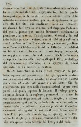 M. De Lamartine ha fama d'uom religioso: fa protesta espressa de' proprii sensi. Ed egli appunto conferma la sentenza altrove riferita: la Religione non è fatta per essere rilasciata alla fantasia d'un poeta. Già fu rimproverato per aver nelle sue meditazioni toccato certi punti, sui quali, repressa la fantasia, il teologo grave, in prosa dettata dalla ragione, prendendo a usare le voci medesime degli scrittori ispirati, sceglie, e colloca pensatamente ogni parola, onde da sola una inavvedutamente scelta, o collocata, non venga violato il confine sacrosanto ed angusto, in cui sta il vero. Allora mancò forse l'A. per sola avventataggine; qui egli erra. Passiamo lo sbaglio, in cui cade, confondendo l'albero della vita con quello della scienza del bene, e del male.