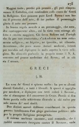 Maggior torto, perchè più pensato, gli può rimproverare il Cattolico, cioè confondere colla causa de' Greci la Religione. Così pensasse pure Lord Byron: non basta il precetto dell'arte, di far parlare il personaggio giusta il noto suo pensare.