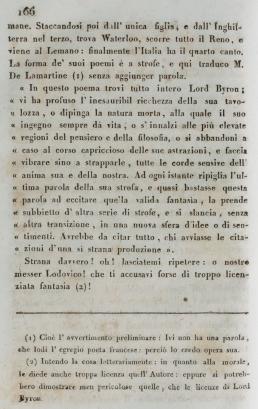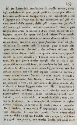 Era già pronto alla stampa l'articolo Romanticismo, quando mi è venuto fra mano le dernier Chant de Childe Harold, con che il rinomatissimo poeta M. De Lamartine ha voluto dare il compimento del Childe Harold di Lord Byron. Lo leggo con premura, lo rileggo per veder, se mi convertirà. M. De Lamartine professa religione: ammirazione a Lord Byron: sicchè le sue cose proprie saranno irreprensibili: scolperà a tutto potere il Lord: se ne concede alcun difetto, non sarà dettato dalla prevenzione.