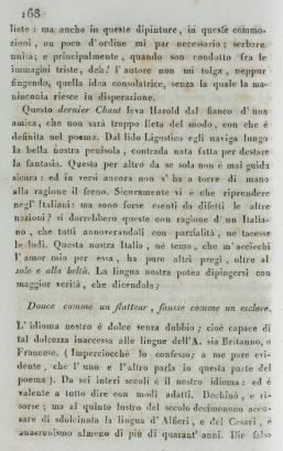 L'idioma nostro è dolce senza dubbio; cioè capace di tal dolcezza inaccessa alle lingue dell'A. sia Britanno, o Francese. (Imperciocchè lo confesso; a me pare evidente, che l'uno e l'altro parla in questa parte del poema). Da sei interi secoli è il nostro idioma: ed è valente a tutto dire con modi adatti. Dechinò, e risorse; ma al quinto lustro del secolo decimonono accusare di sdolcinata la lingua d'Alfieri, e del Cesari, è anacronismo almeno di più di quarant'anni. Dir falso un idioma, per me non ha senso. Fosse tale, che esprimesse un pensier diverso da quel di chi parla: fosse almeno disarmonico, e quasi voce falsa, ferisse il senso di chi ode! il nostro non è; ed agevolmente si potrebbe mostrare atto a dire vero, ed aspro nel rispondere a queste tacce: ma scusiam nel poeta il trascorrimento della fantasia, appagata d'un verso, che crede arguto e sentenzioso. Io scrivo in prosa: debbo infrenare il dispetto patrio, ancorchè giusto; e star fra i riguardi della cortesia, che nella mia patria si conosce, e si pratica per lo meno al pari, che in qualunque altra contrada. Non è altronde meraviglia, se i forestieri così parlano: continuo esempio ne hanno da tanti nostri amatori della patria intesi nel vilipenderla così, che par loro di rinsanguinare, quanto più l'hanno vituperata. Il vero amore trascorre talvolta alla rampogna: ma pur serba modi riverenti ad una madre pregevole per altro, che pel sole, la beltà, e le arti belle.