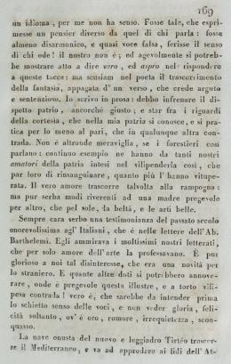 Sempre cara serbo una testimonianza del passato secolo onorevolissima agl'Italiani, che è nelle lettere dell'Ab. Barthelemi. Egli ammirava i moltissimi nostri letterati, che per solo amore dell'arte la professavano. E pur glorioso a noi tal disinteresse, che era una novità per lo straniero. E quante altre doti si potrebbero annoverare, onde è pregevole questa illustre, e a torto vilipesa contrada! vero è, che sarebbe da intender prima lo schietto senso delle voci, e non veder gloria, felicità soltanto, ov'è oro, romore, irrequietezza, sconquasso.