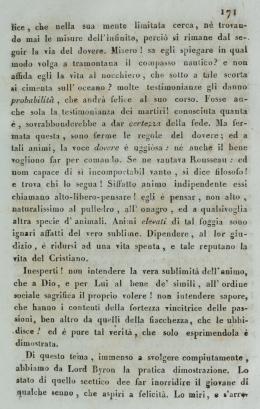 Infelice Byron! non giunto alla metà d'un natural corso di vita, celebrato fra i primi ingegni letterarii dell'epoca presente, eccolo sazio; infastidito: anelare a glorie differenti (I), ove è lecito dubitar, che valesse a riuscire; valendo, riuscisse; riuscendo, non le venisse anche a fastidire. Abbominevole filosofismo! quanti diletti gli furasti! quanta gloria! e quella suprema di giovare altrui! chè volendo, potea. Lo scorgi, allorchè, diradandosi la nebbia, gli sfavillava alla mente la Luce Essenziale. Tradotto in prosa il suo canto d'Albano, serba pure alti sensi. Con enfasi poetica saluta il mare glorioso specchio, nel quale si compiace contemplandosi l'Onnipotente. Nella vivacità della sua fantasia digrada, e forse troppo, gli sforzi dell'uomo, su quell'elemento. Limitati sono (I): creata all'immortalità quell'anima non s'appaga del finito. Contempla quei superbi flutti, nei quali furono tante generazioni sommerse; sfracellati e distrutti scogli, città, isole, contrade; e quella immensità lo innalza al Creatore. Ecco, che la Religione, anzichè impicciolire l'ingegno umano, sola gli apre infinito campo! senza questa riuscita, non cadeva tronco il canto del poeta? o potrebbe produrre vero effetto sull'animo nostro, cantando un ente fantastico? Ci colpiscono, è vero, le grandi immagini, con che Omero, Virgilio di tratto dipingono i Numi loro onnipotenti. Giove con uno sguardo move l'universo: un cenno di Nettuno spiana il mare in tempesta: noi non credendo nè Giove, nè Nettuno, pure estatici gli ammiriamo. L'armonia, la grandiloquenza, la maestria del verso concorrono, sì, a destare una vibrazione mista di fisico, e di morale: ma l'appagamento, che da quelle immagini riporta la mente, è vero effetto della fede naturale all'animo nostro, per cui si applicano in genere alla Divinità, che crediamo; sono un richiamo, un ricordo dell'oggetto sommo, del Supremo Padrone, del quale, quanto può umano inventare, esprimono la grandezza, la maestà, l'onnipotenza. Giovani, in cui arde bollor poetico, volete, che vi sublimi a sublimità vera? credete in Dio. Lo credevano, come noi, e Dante e Tasso e Chiabrera e Guidi e Filicaia; e sublimi ne furono i canti; lo credono tuttora ingegni peregrini, in maggior numero, che nol pensate. Ma la Fede vostra vi ispiri riverenza alla Parola di quel Dio; vi distolga dal menomamente alterarla, e lo sgarrare de' buoni inavveduti vi sia maestro di cautela.