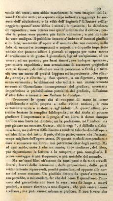 "Che cosa è egli mai la sentenza d'un giornalista? L'opinione individuale d'un uomo, che o per ismania di dare un giudizio, o per mestiere, o per affetto, o per odio, si mette ad esaminare con più o meno diligenza un'opera della quale o egli non conosce l'autore, o male lo conosce, o troppo, e decide in poche e assolute parole s'ella sia buona o cattiva. Lasciamo l'inconveniente del non conoscere o del conoscere in modo da ispirare parzialità, la persona, le opinioni, le condizioni, il carattere dell'autore: ma questo solo atto d'un uomo che all'individual sua ragione presume di sottoporre ingegni forse grandemente maggiori del suo, opere che son frutto di lunghi studii e di scienza vastissima, questo solo atto suppone o un orgoglio o una leggerezza sufficiente a invalidare l'autorità di quegli assoluti giudizii. — Darà egli a conoscere l'opera per via d'estratto? Mezzo insufficiente ad offrire piena idea dell'intero, che risulta dal complesso delle menome particolarità; mezzo arrendevole alle reticenze, alle omissioni, alle esagerazioni, alle parodie. — La darà egli a conoscere per via di citazioni, e coprirà le intenzioni proprie sotto il manto del medesimo autore? Ma e chi mi dice ch'egli non abbia prescelti i passi migliori, o i più deboli; che con maligni ravvicinamenti, con interpretazioni più dotte e più feconde del testo, non abbia mascherata la vera imagine del lavoro? Or che sarà, se a queste colpe indirette s'aggiunga la sozzura dell'adulazione, o la viltà dell'ingiuria? L'Autore svillaneggiato, quand'anco abbia i mezzi, la pazienza, la debolezza di rispondere, non otterrà mai quell'udienza che il critico, perchè la prima voce penetra più facile addentro, e più di tutte la voce maligna. Il pubblico intanto s'imbeve d'inesatti giudizio e di falsi, sentenzia d'opere e d'uomini che non conosce, sulla fede di censori o incompetenti o sospetti; e di quelle imperfette notizie che possono offrire i giornali si appaga per tutta merce d'erudizione e di gusto. I giornalisti, ligi ad un'opinione, ad un uomo, ad un partito, per bassi timori, per indegne speranze, per misera caparbietà, non arrossiscono di sostenere pregiudizio vieti e funesti, di diffondere novità pericolose o futili; e tutto ciò con un tuono di gravità leggiera ed impertinente, che offende, annoja, e ributta." Son queste, a un dipresso, esposte senza cerimonia, le obbiezioni che molti e non immeritamente movono al Giornalismo: incompetenza del giudice; necessaria imperfezione o probabilissima parzialità del giudizio, diffusione d'idee false o inesatte. — Vediam le discolpe.
