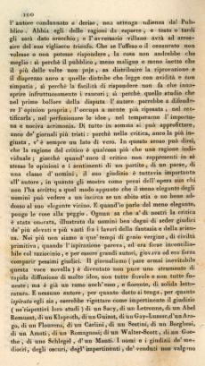 Ma ne' tanti libri ch'escono da tanti paesi e da tanti cervelli diversi, havvi delle intenzioni, delle proposizioni, delle parti evidentemente riprovevoli, perchè pericolose, ed opposte alle norme del senso comune. Un giudizio dettato da quest'avvertenza non potrebbe, a mio credere, far che del bene. E quand'anco l'opinione del giornalista non fosse la vera, essa dà luogo a nuovi pensieri, a nuove ricerche, a una disputa, che può essere oziosa e villana, ma può essere urbana e proficua. E non è vero che l'autore condannato o deriso, non ottenga udienza dal Pubblico. Abbia egli delle ragioni da esporre, e tosto o tardi gli sarà dato orecchio; e l'avversario villano avrà ad arrossire del suo vigliacco trionfo. Che se l'offeso o il censurato non volesse o non potesse rispondere, la cosa non andrebbe che meglio: sì perchè il pubblico, meno maligno e meno inetto che il più delle volte non paja, sa distribuire la riprovazione e il disprezzo anco a quelle diatribe che legge con avidità e con simpatia, sì perchè la facilità di rispondere non fa che innasprire infruttuosamente i rancori; sì perchè quello studio che nel primo bollore della disputa l'autore porrebbe a difendere l'opinion propria, l'occupa a mente più riposata, nel rettificarla, nel perfezionare le idee, nel temperarne l'importuna e nociva acrimonia. Di tutto in somma si può approfittare, anco de' giornali più tristi: perchè nella critica, anco la più ingiusta, v'è sempre un lato di vero. In questo senso può dirsi, che la ragione del critico è qualcosa più che una ragione individuale; giacchè quand'anco il critico non rappresenti in sè stesso le opinioni e i sentimenti di un partito, di un paese, di una classe d'uomini, il suo giudizio è tuttavia importante all' autore, in quanto gli mostra come pensi dell'opera sua chi non l'ha scritta; a quel modo appunto che il meno elegante degli uomini può vedere a un incirca se un abito stia o no bene addosso al suo elegante vicino. E quand'io parlo del meno elegante, pongo le cose alla peggio. Ognun sa che a' di nostri la critica è stata onorata, illustrata da uomini ben degni di seder giudici de' più elevati e più vasti fra i lavori della fantasia e della scienza. Noi più non siamo a que' tempi di genio vergine, di civiltà primitiva, quando l'ispirazione pareva, ed era forse inconciliabile col raziocinio, e per essere grandi autori, giovava od era forza comparir pessimi giudici. Il giornalismo (pare ormai inevitabile questa voce novella) è diventato non pure uno strumento di rapida diffusione di molte idee, non tutte frivole e non tutte funeste; ma è già un ramo anch'esso, e fiorente, di solida letteratura. E nessuno autore, per quanto dotto si tenga, per quanto ispirato egli sia, oserebbe rigettare come impertinente il giudizio (ne' rispettivi loro studi) di un Sacy, di un Letronne, di un Abel Remusat, di un Klaproth, di un Guizot, di un Gay-Lussac, d'un Arago, di un Flourens, di un Carlini, di un Sestini, di un Borghesi, di un Amati, di un Romagnosi; di un Walter-Scott, di un Goethe, di uno Schlegel, d'un Monti. I nomi e i giudizii de' mediocri, degli oscuri, degl'impertinenti, de' venduti non valgono a togliere all'ufizio del critico la sua dignità. E si può bene affermare che in coloro i quali dalle esagerazioni o adulatorie o maligne della critica si lasciano illudere, anco se i giornali non esistessero, le illusioni del pregiudizio non sarebbero però nè più rare nè men deplorabili. Giudicare un'occupazione, un ufizio da' suoi abusi, egli è un aggregarsi alla monomania di coloro che non vogliono filosofia, perchè v'ha de' filosofi cicaloni. — Infine si può bene essere tutt'altro che un uomo di genio, un grand'uomo, e parlare intorno alle opere de' grand'uomini (posto che tutti gli autori sien tali) ragionevolmente, utilmente; non già col dettare sentenze, non già coll'imporre precetti, ma col dare a conoscere quello che nella scienza, nell'arte s'è fatto, e quel che resta da fare. Quand'anco, per evitare cerimonie tediose e che parrebbero ipocrite, il giornalista esponga il parer suo franco e libero; senza le clausole così pare a me; se non erro, e simili; ognuno che ha senno intende bene che non d'altro si tratta se non d'una opinione; e che, se le stesse accademie sono fallibili, l'infallibilità non è certo da presumere che vada a rifugiarsi nelle pagine d'un giornale. Ciò premesso, una volta per sempre, veniamo al novello romanzo dell'egregio Italiano.