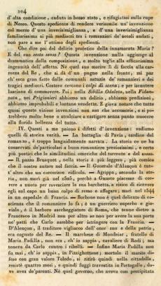 Che dire poi del delirio profetico della innamorata Maria? E del suo sesto senso? Questa invenzione nulla aggiunge al drammatico della composizione, e molto toglie alla efficacissima ingenuità dell'affetto. Nè quel suo morire lì di faccia alla carrozza del Re, che si dà d'un pugno nella fronte, mi par ch'esca gran fatto dalle comunali astuzie de' romanzieri e dei tragici mediocri. Costoro cercano i colpi di scena; e per iscuotere lasciano di commovere. Poi; nella Sibilla Odaleta, nella Fidanzata, nei Prigionieri abbiamo un delirio, abbiamo predizioni, abbiamo improbabili e lontane vendette. E giova notare che tutte quasi queste viziose invenzioni non son che accessorie, e si potrebbero molto bene o stralciare o castigare senza punto nuocere alla florida bellezza del tutto.