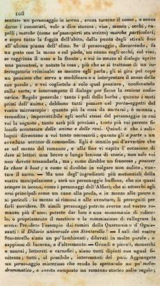 V. Sapete voi, amico lettore, le regole dietro le quali va composto un romanzo che meriti il nome di storico, senza timor di sbagliare? Ascoltate; e dalla pratica de' romanzi storici che vengono pullulando da ventiquattr'anni in quà, io, con maestria Aristotelica, vi estrarrò bell'e intera la teoria. — Primieramente, tutti i capitoli debbono incominciare da una citazione o di poeta od anche di prosatore; se oscura, se impertinente alla cosa di cui si tratta nel capitolo, tanto meglio. — Poi, il vostro romanzo prenderà le mosse o da un buon pezzo di storia cruda, lardellata di qualche similitudine, di qualche sentenza, di qualche citazione o furtiva o patente: ovvero da una buona descrizione topografica d'una valle, d'un monte, d'una città , d'un castello. Riman libero al genio scegliere tra queste due vie: ma la regola generale si è che nel principio del romanzo si debba trovare il brano di storia, e la parafrasi d'una carta topografica. Poi venga un bel dialogo che vi faccia conoscere bene bene di che cosa si tratti. Questo dialogo può essere o serio o faceto: ma faceto sarà migliore; e ciò che più importa, dev'esser lungo. — La lunghezza ancor più che ne' dialoghi, è di regola nelle descrizioni. Voi non dovete presentare un personaggio in iscena, senza tacerne il nome, e senza darne i connotati, vale a dire statura, viso, mento, occhi, capelli, marche (come ne' passaporti sta scritto) marche particolari; e sopra tutto la foggia dell'abito, dalla punta degli stivali fino all'ultima piuma dell'elmo. Se il personaggio, discorrendo, fa un gesto con la mano o col piede, un cenno cogli occhi, col viso, se raggrinza il naso o la fronte, e voi in mezzo al dialogo aprite una parentesi, e notate la cosa, più che se si trattasse di un interrogatorio criminale: se mentre egli parla, gli si gira pel capo un pensiero che serva a modificare o a interpretare il senso delle sue parole, e voi coglietelo a volo quel pensiero, conficcatelo sulla carta, e interrompete il dialogo per farne la sezione cadaverica. Regola generale: tanto i peli della barba, quanto i moti primi dell'anima, debbono tutti passare nel porta-oggetti del vostro microscopio: quanto più la cosa da narrarsi, è minuta, recondita, impercettibile agli occhi stessi del personaggio in cui voi la sognate, tanto sarà più preziosa, tanto più voi parrete filosofo scrutatore delle anime e delle reni. Quindi è che i soliloquii diventano a voi tanto necessarii, quanto gli a parte a un avveduto scrittor di commedie. Egli è inutile poi d'avvertire che se nel mezzo del romanzo, o alla fine vi capita l'occasione di dare ai lettori una breve o lunga lezione di storia, non solo voi non dovete trasandarla, ma, come direbbe un francese, pousser la chose à bout; e come si direbbe in volgare non aulico, vuotare il sacco. — Ma uno degl'ingredienti più sostanziali della vostra manipolazione, sarà un personaggio buffone, che sia quasi sempre in iscena, come i personaggi dell'Alfieri; che si attacchi agli eroi principali come un cane alla preda, e in mezzo alle paure e ai pericoli, in mezzo ai rimorsi e alle sventure, li perseguiti per farli sorridere. Di simili personaggi potrete averne nel vostro romanzo più d'uno; potrete dar loro o una monomania di ridicolo, o propriamente il mestiere e la commissione di rallegrare la scena. Prendete l'esempio dai comici della Quarconia e d'Ognissanti: il Diluvio universale con Stenterello! — I sali del vostro Stenterello siano un po' lambiccati, dilavati in molte parole, e sappiano di lucerna, e d'oltremonte. — Grandi e piccoli, monarchi e usurai, letterati e carnefici, siano tutti dipinti con ugual finitezza; tutti, al possibile, interessanti del pari. Aggiungete un personaggio misterioso che renda lo spettacolo un po' melodrammatico, e avrete composto un romanzo storico nelle regole; bello se il vostro ingegno è potente; mediocre se il vostro ingegno è dappoco : ma sempre però nelle regole. (I)
