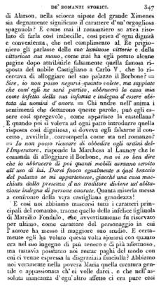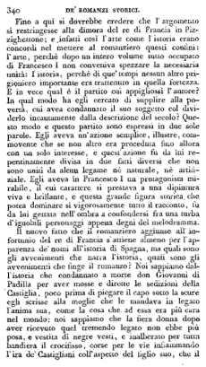 Fino a qui si dovrebbe credere che l'argomento si restringesse alla dimora del re di Francia in Pizzighettone; e infatti così l'arte come l'istoria erano concordi nel mettere al romanziere questi confini: l'arte, perché dopo un intero volume tutto occupato di Francesco I non conveniva spezzare la necessaria unità: l'istoria, perché di que' tempi nessun altro prigioniero importante era trattenuto in quella fortezza. E in vece qual è il partito cui appigliossi l'autore? In qual modo ha egli cercato di supplire alla povertà, cui avea condannato il suo soggetto col dividerlo incautamente dalla descrizione del secolo? Questo modo e questo partito sono espressi in due sole parole. Egli aveva un'azione semplice, illustre, commovente che se non altro era proceduta fino allora con un solo interesse, e quest'azione fu da lui repentinamente divisa in due fatti diversi che non sono uniti da alcun legame né naturale, né artifiziale. Egli aveva in Francesco I un protagonista mirabile, il cui carattere si prestava a una dipintura viva e brillante, e questa grande figura storica che potea dominare sì vigorosamente tutto il racconto, fu da lui gettata nell'ombra a confondersi fra una turba d'ignobili personaggi appena degni del melodramma.