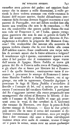 Il nuovo fatto che il romanziere aggiunse all'infortunio del re di Francia s'attiene almeno per l'apparenza de' nomi all'istoria di Spagna, ma quali sono gli avvenimenti che narra l'istoria, quali sono gli avvenimenti che finge il romanzo? Noi sappiamo dall'istoria che condannato a morte don Giovani di Padilla per aver mosse e dirette le sedizioni della Castiglia, poco prima di piegare il capo sotto la scure egli scrisse alla moglie che le mandava in legato l'anima sua, come la cosa che ad essa era più cara nel mondo: noi sappiamo che la fiera donna dopo aver ricevuto quel tremendo legato non ebbe più posa, e vestita di negre vesti, e inalberato per tutta bandiera il crocifisso, corse per le vie infiammando l'ira de Castigliani coll'aspetto del figlio suo, che il carnefice avea privato del padre: noi sappiam finalmente che in mezzo a mille dissensioni, a mille pericoli la forte vedova sostenne con virile costanza le fazioni dell'estinto marito, finché abbandonata interamente dalla fortuna dovette fuggirsi travestita a' suoi parenti di Portogallo, ove nel dolore meditò fino alla morte una vendetta che non le fu conceduta. – Ed ora chi crederebbe che questa nobile donna che mai non vide né Francesco I, né l'Italia, questa coraggiosa guerriera che non fu mai in potere di Carlo V fosse dal nostro autore gettata nella fortezza di Pizzighettone a dividere la prigionia del Monarca francese? Chi crederebbe che intorno alla memoria di questa vedova illustre che fu così fedele alla causa dell'infelice marito, fosse condensata una turpe nebbia di secondi amori che la fanno abbietta e volgare? E nondimeno egli è questo, unicamente questo e non altro il bel partito che il romanziere seppe trarre dall'istoria di Spagna. Maria Padilla si trova già prima del Re di Francia nella rocca di Pizzighettone, e gli sforzi che si fanno per liberare lei e Francesco I da quella fortezza, costituiscono tutto il romanzo. A procurare lo scampo di Francesco I intendono Marsilio Fondulo e Stefano Guasco, cui si aggiunge, ma solo in apparenza, Cornelio Agrippa: a procurare la fuga di Maria Padilla s'accordano il fratello e l'amante di lei, cui si unisce per un momento l'assistenza del cavaliere Goffredo. I partigiani del Re s'aggirano intorno alla rocca preparando uno stratagemma che ridoni al Monarca la libertà: il fratello e l'amante di Maria Padilla vi sono già penetrati sotto le vesti di due cavalieri di S. Giovanni che tornano da Marmara, ove dopo la presa di Rodi furono ostaggi di Solimano. – Ecco le due principali azioni che in tutto il corso del romanzo si dividono costantemente ogni interesse, ecco per meglio dire i due romanzi che sono a forza ravviluppati insieme senza aver nulla di comune, tranne il luogo ov'è posta la scena, senza aver un nesso qualunque che almeno per forma valga a rannodarli in un solo e generale concetto.