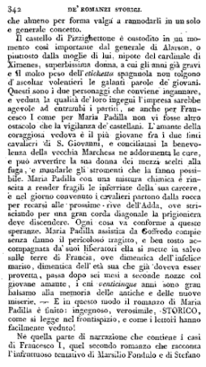 Il castello di Pizzighettone è custodito in un momento così importante dal generale di Alarson, o piuttosto dalla moglie di lui, nipote del cardinale di Ximenes, superbissima donna, a cui gli anni già gravi e il molto peso dell'etichetta spagnuola non tolgono d'ascoltar volentieri le galanti parole de' giovani. Questi sono i due personaggi che conviene ingannare, e veduta la qualità de loro ingegni l'impresa sarebbe agevole ad entrambi i partiti, se anche per Francesco I come per Maria Padilla non vi fosse altro ostacolo che la vigilanza de' castellani. L'amante della coraggiosa vedova è il più giovane fra i due finti cavalieri di S. Giovanni, e conciliatasi la benevolenza della vecchia Marchesa ne addormenta le cure e può avvertire la sua donna dei mezzi scelti alla fuga, e mandarle gli stromenti che la fanno possibile. Maria Padilla con una mistura chimica è riuscita a render fragili le inferriate della sua carcere e nel giorno convenuto i cavalieri partono dalla rocca per recarsi alle prossime rive dell'Adda, ove strisciando per una gran corda diagonale la prigioniera deve discendere. Ogni cosa va conforme a queste speranze. Maria Padilla assistita da Goffredo compie senza danno il pericoloso tragitto, e ben tosto accompagnata da' suoi liberatori ella si mette in salvo sulle terre di Francia, ove dimentica dell'infelice marito, dimentica dell'età sua che già doveva esser provetta, passa dopo sei mesi a seconde nozze col giovane amante, i cui venticinque anni sono gran balsamo alla memoria delle antiche e delle nuove miserie. – E in questo modo il romanzo di Maria Padilla è finito: ingegnoso, verosimile, STORICO, come si legge nel frontispizio, e come i lettori hanno facilmente veduto!