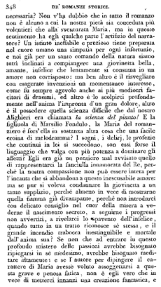 E così noi abbiamo trascorsi tutti i caratteri principali del romanzo, tranne quello della infelice figliuola di Marsilio Fondulo, che avvertitamente fu riservato per ultimo, come carattere del personaggio in cui l'autore ha messo il maggiore suo studio. E certamente egli ha voluto questa volta ajutarsi con quanto era nel suo ingegno di più tenero e di più affettuoso, ma tuttavia possiamo noi restar paghi del modo con cui ci venne espressa la disgraziata fanciulla? Abbiamo noi veramente nella povera Maria quella creatura gentile o appassionata ch'ei volle darci, e che nell'assoluta mancanza d'ogn'altro affetto ci era pure così necessaria? Non v'ha dubbio che in tutto il romanzo non è alcuno a cui la nostra pietà sia conceduta più volentieri che alla sventurata Maria, ma in questo sentimento ha egli qualche parte l'artifizio del narratore? Un istinto ineffabile e prezioso tiene preparata nel cuore umano una simpatia per ogni infortunio, e noi già per un santo comando della natura siamo tutti inclinati a compiangere una giovinetta bella, amante, infelice che lentamente si consuma in un amore non corrisposto: ma ben altro è il risvegliare con esagerate invenzioni un momentaneo interesse, come fu sempre agevole anche ai più mediocri facitori di drammi, ed altro è lo scolpirci profondamente nell'anima l'impronta d'un gran dolore, altro è il possedere quella scienza difficile che dal nostro Alighieri era chiamata la scienza del pianto! E la figliuola di Marsilio Fondulo, la Maria del romanziere è fors'ella in sostanza altra cosa che una facile eroina di melodramma? I sogni, i delirj, le profezie che continui in lei si succedono, son essi forse il linguaggio che valga con più potenza a dominare gli affetti? Egli era già un pensiero mal avvisato quello di rappresentarci la fanciulla innamorata del Re, perché la nostra compassione non può essere intera per l'incauta che si abbandona a questo inescusabile amore: ma se pur si voleva condannare la giovinetta a un tanto supplizio, perché almeno in vece di mostrarne quella fiamma già divampante, perché non introdurci con delicato consiglio nel cuor della misera a vederne il nascimento secreto, a seguirne i progressi non avvertiti, a rivelarci lo spavento dell'infelice, quando tutto in un tratto riconosce sé stessa, e il grande incendio trabocca inestinguibile e mortale dall'anima sua? Se non che ad entrare in questo profondo mistero delle passioni avrebbe bisognato ripiegarsi in sé medesimo, avrebbe bisognato meditare altamente: e se l'autore per dipingere il carattere di Maria avesse voluto assoggettarsi a questa grave e penosa fatica, non è egli vero che in vece di metterci innanzi una creazione fantastica, e bizzarramente divisa dalle nostre affezioni, ci avrebbe offerto un essere umano e possibile? Non è egli evidente che in vece di ricorrere alla sua memoria per accozzare insieme la Minna del Pirata e la Chiara delle Acque di S.Ronano, ci sarebbe disceso nelle viscere del cuor suo a trovarvi la donna che tutti volessero amare? Non la inferma di catalepsi, non la scozzese dotata (incredibile a dirsi) della seconda vista, ma la donna italiana, un'immagine vera di quelle donne sì affettuose che seppero inspirare al povero Otway le celebri parole della Venezia salvata, parole soverchiamente profane, ma pure inebbriate di tanta dolcezza = Ah donne, amabili donne, la natura vi formò per ammansare gli uomini: ché senza il vostro ajuto noi saremmo rimasti selvaggi. Per rappresentare la bellezza degli angeli, è forza dipingerli a voi somiglianti: in voi si trova tutto quello che noi pensiamo del cielo: splendore, purezza, verità, gioja eterna e amore infinito. =