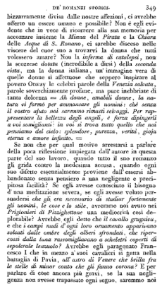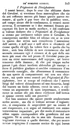 I nostri lettori, dopo le cose che abbiamo detto del Gerolimì, si vorranno forse maravigliare che sia da noi collocato ancora più basso questo nuovo romanzo, al quale è pur vero che la pubblica voce nel tempo stesso che lo condannava, si mostrò meno avversa. E certamente se i due romanzi fossero paragonati fra loro in modo assoluto, e dal confronto si volesse dedurre che i Prigionieri di Pizzighettone si stanno per intrinseco valore sotto il Gerolimì, la conseguenza sarebbe falsa ed odiosa: ma se in vece in questi due scritti sarà considerata l'intenzione dell'autore, e nell'uno e nell'altro si chiamerà ad esame quello ch'egli ha voluto fare e quello che ha fatto, sarà ben difficile di non riconoscere che nel secondo romanzo egli è rimasto al di quà della sua meta più assai che nel primo. Il Gerolimì potea parere un error momentaneo dell'ingegno, un breve trascorso della fantasia, di che pur troppo anche presso i più chiari intelletti abondan gli esempi: e forse il pubblico giudizio si sarebbe contentato d'un amorevole consiglio, che allontanasse il romanziero da una specie di componimenti cui non era chiamato, ma quale scusa resterà pei Prigionieri di Pizzighettone, ove si scorge ad evidenza che l'autore lungi dal volersi abbandonare ad una bizzarria, lungi dal tentare un facile scherzo, cercò in vece, e rinvenne un argomento di tutta importanza, e nondimeno in mezzo alle più elette ricchezze dell'istoria rimase ancora nella sua povertà?