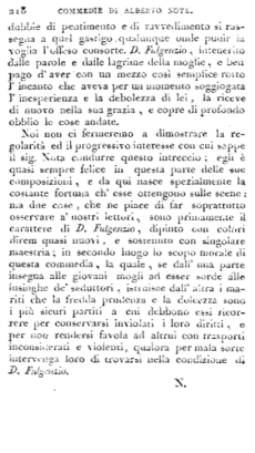 Noi non ci fermeremo a dimostrare la regolarità ed il progressivo interesse con cui seppe il sig. Nota condurre questo intreccio; egli è quasi sempre felice in questa parte delle sue composizioni, e da qui nasce spezialmente la costante fortuna ch'esse ottengono sulle scene: ma due cose, che ne piace di far soprattutto osservare a' nostri lettori, sono primamente il carattere di D. Fulgenzio, dipinto con colori direm quasi nuovi, e sostenuto con singolare maestria; in secondo luogo lo scopo morale di questa commedia, la quale, se dall'una parte insegna alle giovani mogli ad esser sorde alle lusinghe de' seduttori, istruisce dall'altra i mariti che la fredda prudenza e la dolcezza sono i più sicuri partiti a cui debbono essi ricorrere per conservarsi inviolati i loro diritti, e per non rendersi favola ad altrui con trasporti inconsiderati e violenti, qualora per mala sorte intervenga loro di trovarsi nella condizione di D. Fulgenzio.