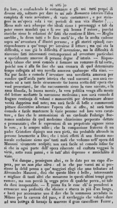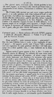 Appena uscita l'opera ognuno si fece a dire: è uscito un Romanzo storico di Manzoni. La celebrità del nome trasse tosto numerosissimi ammiratori all'acquisto, ed alcuni sempre fermi nel volerlo battezzare per Romanzo, lo trovarono sotto questo aspetto sterile e poco interessante. Trattasi, dicono quelli, di due paesani (Renzo e Lucia) che s'hanno a sposare e che un feudatario prepotente glielo impedisce con ogni sorta di mezzi; dopo gran traversie si sposano, e li finisce la dolorosa istoria, poichè tutti gli altri fatti e narrazioni s'hanno a considerare come altrettanti episodi, e formano invece il nerbo del libro. – Io rispondo a questa prima quistione, che il rinomato autore di tante belle poesie e di ben altri lodati componimenti non comincia dal dire sua propria quest'opera, e che quand'anche la si fosse, egli l'ha intitolata Storia milanese del secolo XVII.°... perchè dunque la si vuole un Romanzo?... Certo che se si fosse inteso di offrici un romanzo storico sulle traccie di Walter-Scott, doveasi innalzare fra più nobili subbietti la scelta de' protagonisti, onde l'interesse generalmente eccitato venisse per le avventure di personaggi degni veramente d'istoria. Ma non vediamo noi forse che appunto l'illustre Scozzese costretto a non smuovere se non storicamente dalle capitali o dai determinati luoghi i suoi personaggi illustri, inganna poi e tradisce il lettore facendo in un luogo accadere cose avvenute le mille miglia lontane, e ravvicinando epoche distantissime fra loro, e confondendo le costumanze e gli usi tutti propri di diverse età, soltanto per dare in un solo Romanzo istorico l'idea completa di varie avventure, di varie costumanze, e per stringere in un'epoca sola i varj periodi di una vita illustre?... Meno male sarà adunque che ideali sieno i personaggi e tali da poter essere mandati qua e là ove più brama l'autore, purchè storiche sieno le relazioni de' fatti che contiene il libro. – Meglio sarebbe, lo dicon tutti e lo dico anch'io, che la scelta cadesse sopra un'avventura d'illustri persone, e gli storici episodj corrispondessero a que' tempi per istruirne il lettore; ma qui sta la difficoltà, e non già la difficoltà d'invenzione, ma la difficoltà di rinvenire fatti interessanti contemporanei ad avventure particolari e specialmente amorose di persone degne d'istoria. – Risponderà taluno che assai comodo è formare un romanzo di tal sorta, poichè non è alla fin fine che una cronaca di quel determinato tempo collegata ad una novella amorosa qualunque ella siasi. – Sia pur facile e comodo l'inventare una novelletta amorosa per condire quell'arida parte istorica che vuol narrarsi, non sarà comodo nè a tutti facile sicuramente far buona scelta dell'epoca che vuol presentarsi, far che succosamente sieno le cose narrate, e la sana filosofia, la buona morale, la vera politica venga alla mente del lettore mediante la narrazione medesima; non sarà comodo il frugare centinaja di volumi e manoscritti per determinare alcune verità dapprima mal note; non sarà facile di belle e commoventi pitture descrittive adornare l'opera che si offre, nè sarà tanto comodo e facile mantenere le varie persone nel loro vero carattere, e fare che le ammonizioni di un cardinale Federigo Borromeo sembrino da quel medesimo chiarissimo porporato dettate e pronunziate; che le espressioni di un prepotente signore sieno le vere, e le sempre udite; che la compassione fraterna di un padre Cristoforo dipinga una rara pietà, ma probabile altronde in persone benemerite a Dio; che i tristi effetti di una forzata monacale reclusione sieno que' tanti mali che vediamo nell'opera del Manzoni vivamente scolpiti; non sarà facile nè comodo infine far sì che in ogni parte dell'opera rilucente ed esaltata veggasi la virtù, sotto rozzi panni, e in tutt'altri depresso e annichilito il vizio.