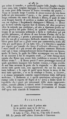 Voi dunque, prosieguon altri, ce lo date per un capo d'opera, per un non plus ultra: ed io che pur vorrei mi si prestasse la debil penna a que' maggiori elogi che amo tributare ad Alessandro Manzoni, dirò che questo libro è bello, interessante e migliore di tanti altri che menarono in questi ultimi tempi gran rumore, ma non perciò lo veggo privo di qualche pecca, nè tale da dirsi insuperabile. – È prima fra le cose ch'io prenderei a censurare una prolissità che sfinisce e stucca in più d'un luogo, e basti per accennarne uno il dire che la sommossa accaduta in Milano per la carezza del pane, e il saccheggio che voleasi dare ad una bottega di fornajo fa muovere il gran cancelliere Ferrer, per sedare il tumulto, e quattordici pagine belle, lunghe e larghe come sono, tutte vengono impiegate a descriverci l'andata non più di cento passi della carrozza di Ferrer circondata dal popolo. – Viene in secondo luogo l'inutilità di alcune nozioni che non fanno bella nè più interessante l'opera, e fra queste quello sciocco e lungo contrasto che nasce fra Bortolo e Renzo, il quale di tutto avea bisogno fuorchè di perdersi a cicalare sul nome di bagiano con cui sogliono i Bergamaschi distinguere i Milanesi. – Renzo poi lo trovo talvolta ingenuo fuor di misura, tal altra perspicace oltre la naturale sua condizione, ed atto a riportarmi perfino un'intiera predica del padre Felice; in qualche incontro mancante troppo di un necessario ardimento e facile a confondersi pel più piccolo imbarazzo, ed altrove di una fortezza d'animo che lo innalza all'eroismo, e pronto a pronunciar sentenze ed a filosofare più che non gli si convenga; furibondo amante della sua Lucia, talora passa molt'ore e giorni senza pur rammentarla; tratto alla città per quell'amore di cui tutto vive, n'è dimentico e spogliato per seguire que' tumulti che fanno d'ordinario allontanare anche i meno timidi ed i più avvezzi alle popolari sommosse. Illetterato com'egli è tiene corrispondenza per mezzo di un amico con Agnese, madre di Lucia, la quale fra l'altre accompagna una sua lettera di un soccorso a lui di cinquanta scudi..., e come dunque sta in seguito che Renzo non avesse fatto confidenza a nessuno di quel denaro avuto?... È Renzo perciò l'unico personaggio intorno al quale potrebbero insorgere ben fondate censure, e d'uopo avrebbe di una lima accurata la parte che lo risguarda. – Ma insieme strette tutte queste cose, non appariscono che nei fra mezzo a tante bellezze, e le copie di quest'opera furono in meno di due mesi tutte spacciate, e se ne fa ristampa a Torino, a Livorno, e si stanno preparando comiche rappresentazioni tratte dall'opera medesima, e finalmente si è aperta associazione nel negozio di stampe sotto il coperto de' Figini al n.° 4074 a dodici tavole litografiche che i punti più interessanti della storia rappresenteranno, essendo affidata a valenti artisti l'esecuzione dei disegni che nella dimensione corrisponderanno precisamente al formato dell'opera onde riuscirle di ornamento.