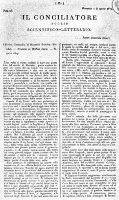 Altra volta ci siamo studiati di dare una giusta idea del merito di Sheridan, poeta comico inglese che prima del sig. Leoni era sconosciuto alla nostra letteratura, e che non va confuso coi più recenti scrittori teatrali di quella nazione. Nell'analizzare la sua Scuola della Maldicenza, ne parve allora conveniente officio della critica il contrassegnare la di lui maniera caratteristica, ponendola a confronto con quella che suole predominare nelle commedie dette de moeurs del teatro francese. Maniera nostra propria in fatto di tali commedie non abbiamo or noi in Italia; però sorpassando la ragione de' confronti parleremo con minor diffusione de' Rivali, altro vantato componimento dello stesso Autore.