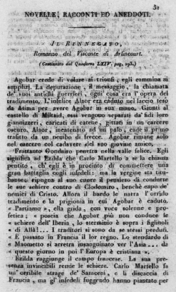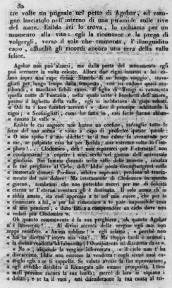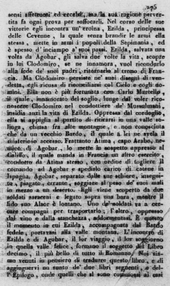 Al tempo di Carlo Martello, la Francia occidentale e meridionale ebbe un fiero guasto dai Saraceni. Agobar, generale di questi barbari seguaci di Maometto, portava lo spavento, l'incendio e il saccheggio dalle rive del Mediterraneo a quelle dell'Oceano. Questo Agobar, l'eroe del romanzo, non era altri che Clodomiro, figlio di Terigi III, e legittimo erede del trono di Francia. Clodomiro in tenera età avea veduto la sua famiglia barbaramente trucidata da un prefetto di palazzo, che regnò momentaneamente in Parigi. Sottratto come per miracolo all'eccidio de' suoi, indi allevato secretamente fra i monti, quando l'età glielo permise egli mosse verso Parigi, ajutato da numerosi aderenti, per ripigliare lo scettro paterno. Ma Carlo Martello che avea preso a signoreggiar la Francia, bandì Clodomiro per impostore e ne sperdè le milizie. Il giovane principe fuggiasco, ferito, coll'animo pien di veleno, avendo per sopraggiunta perduto il fedele suo amico, e la fanciulla che amava, si ribella contro il Cielo e più non crede che alla potenza del male. Egli arriva in Ispagna, si presenta al Califfo, abbiura il Vangelo per l'Alcorano, senza creder più a questo che a quello, ed ottiene il comando di un esercito di Saraceni col quale devasta la Francia. Il carattere di Agobar è imitato dal Corsaro di lord Byron. Egli non alza gli occhi al cielo che per oltraggiarlo, egli non vede sopra la terra che il trionfo della colpa e del tradimento, egli arde e diserta la sua patria per vendicarsi de' mali che in essa ha sofferto. Vive però tuttora nel suo animo il germe de' sensi affettuosi ed eccelsi, ma la sua ragione pervertita fa ogni prova per soffocarli. Nel corso delle sue vittorie egli incontra un'eroina, Ezilda, principessa delle Cevenne, la quale senza brandir le armi ella stessa, mette in armi i popoli della Sepimania, ed è spesso d'inciampo a' suoi passi. Ezilda, salvata una volta da Agobar, gli salva due volte la vita, scopre in lui Clodomiro, se ne innamora, vuol ricondurlo alla fede de' suoi padri, ritornarlo al trono di Francia. Ma Clodomiro persiste ne' suoi disegni di vendetta, egli ricusa di riconciliarsi col Cielo e cogli uomini. Ella non è più fortunata con Carlo Martello, il quale, innamorato del soglio, lunge dal voler riconoscere Clodomiro nel condottiere de' Mussulmani, insidia anzi la vita di Ezilda. Oppressa dal cordoglio, ella si appiglia al partito di ritirarsi in una valle solinga, chiusa fra alte montagne, e non conosciuta che da un vecchio Bardo, il quale a lei ne svela il misterioso accesso. Frattanto Atima, capo Arabo, nemico di Agobar, lo mette in sospetto presso il Califfo, il quale manda in Francia un altro esercito, condotto da Atima stesso, con ordine di togliere il comando ad Agobar e spedirlo carico di catene in Ispagna. Agobar, separato dalle sue schiere, inseguito, piagato, errante, soggiace al peso de' suoi mali in mezzo a un deserto. Egli viene scoperto da due soldati saraceni e legato sobra una bara, mentre il fido suo Alaor è lontano. Uno de' soldati va a cercare compagni per trasportarlo; l'altro, oppresso dal vino e dalla stanchezza, addormentasi. È questo il momento in cui Ezilda, accompagnata dal Bardo fedele, portavasi alla valle montana. L'incontro di Ezilda e di Agobar, il lor viaggio, il lor soggiorno in quella valle felice, formano il soggetto del Libro decimo, il più bello di tutto il Romanzo. [...]