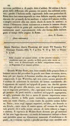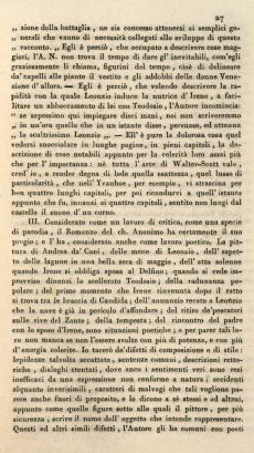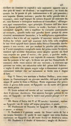 Quando Walter Scott, non bene conscio delle proprie forze, e lontano ancora dal prevedere la grande sua fama avvenire, stava, forse più per diporto di Scozzese erudito che per isfogo di poeta, componendo il suo Waverley, egli non aveva ancora pensato all'artifizio di solleticare la curiosità de' lettori sostituendo all'argomento de' capitoli un'epigrafe di poeta: ma dacchè questa felice idea gli sorse alla mente, non cessò mai di perseguitarlo con sì impronta pertinacia, che, ogni qual volta la memoria non gli prestava da' poeti antichi o moderni un'epigrafe appropriata, ed egli, piuttosto che fare a meno di questo importante ornamento, doveva a bella posta coniarsele, spacciandole poi o sotto un nome illustre, o come tratte da qualche antica ballata. Tanto, anco negl'ingegni superiori, un'idea, sia feconda o sia frivola, corre risico di essere spinta all'eccesso da quel fatale prurito ch'è nella mente umana di tutto ridurre a legge, a sistema. Il capriccio di Walter-Scott diventò per gl'imitatori di lui una legge davvero: e a molti de' romanzieri italiani e francesi parrebbe quasi un dimostrarsi mancanti d'erudizione e di gusto, se a ciascun capitolo (giacchè sacrilega cosa sarebbe non dividere un romanzo in capitoli) non sapessero apporre uno o due paia di versi: se slombati, se impertinenti, se tratti da quanto ha la poesia di più indeterminato e di più generico, non importa. Questo notiamo, perchè fin nelle piccole cose si riconosce, anco negl'ingegni da natura disposti ad avanzare da sè, una funesta e contagiosa tendenza al contraffare, all'esagerare ogni consuetudine, ogni principio. L'autore dell' Ane mort et la femme guillotinée, voleva, io credo, burlarsi, di queste inevitabili epigrafi, atte a repellere la curiosità piuttostochè ad eccitarla, quando nella sua parodia facea pompa di certe citazioni stranamente laconiche, e le moltiplicava, apponendone talvolta e due e tre ad un capitolo. L'anonimo autore d'Irene Delfino ha voluto anch'egli separarsi dalla folla collo scegliere le sue venti epigrafi tutte quante dalla Divina Commedia. Anche questa è una novità: ma per rendere la parodia più compita, io l'avrei consigliato a sceglierle tutte dal primo canto. In questa maniera egli avrebbe dimostrato ancor meglio quanto sia facil cosa scoprire un passo d'antico, che possa, a qualche modo essere collocato in fronte a un capitolo di romanzo. [...]