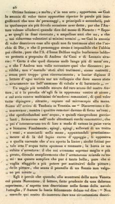 Ottima lezione; e molto, s'io non erro, opportuna. — Così la smania di voler tutte appuntino riportar le parole più insignificanti che uno de' personaggi, o principali o secondarii, può in qualunque sia più frivola occasione aver dette, par che l'Autore volesse alludervi quando dice del messo di Narsete: "Espose quegli in frasi ricercate, e ampollose anzi che no, e che noi ridurremo volentieri ai minimi termini". — Così la smania di voler descrivere cose alle quali non fu testimone altri che l'occhio di Dio, e che il personaggio stesso è impossibile che l'abbia poi riferite, pare che l'A. d'Irene Delfino voglia burlarsene laddove protesta a proposito di Andrea da' Cani e di Leonzio sicario: "Certo è che quel discorso andò lungo più di mezz'ora, e che l'Andrea non volle raccontare quel che dicessero; perilchè, non v'essendo stati altri testimoni, siamo costretti, senza però troppo gran rincrescimento, a lasciar digiuno il lettore d'ogni notizia sur un colloquio che deve essere stato sicuramente un bell'ammasso di cabale e di baratterie". —