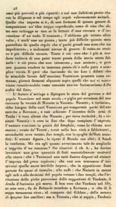 Un saggio più notabile ancora del raro senno del nostro Autore, si è la parodia ch'egli fa in apparenza contro sè stesso e sul serio contro moltissimi de' moderni romanzieri, di quel voler tutto dipingere, ritrarre, copiare col microscopio alla mano. Siamo all'arrivo di Teodosio in Venezia. — "Discorrevano e discorrevano, mentre i quattro rematori davano di forza ne' remi, che sprofondandosi sott'acqua, e quindi risorgendone gocciolanti, formavano nell' onde altrettanti cerchi concentrici, che poi s'intersecavano tra di loro a modo di catena in guise varie e bizzarre. Finalmente, spingi, spingi, sollevati di un tratto i remi, e scorciatili nella mano, appuntandoli prestissimamente al di là del legno curvo d'appoggio, li opponeva a quella corrente che s'era aperta la lintre; sicchè fattasi per tale atto l'acqua tutta spumosa e ronzante, la barca in un subito s'arrestava: il che noi avremmo espresso meglio e più presto, dicendo semplicemente che l'arrestarono sciando co' remi: ma questo semplice che pur è tanto bello, pare che si voglia sfuggirlo a più potere per sostituirvi delle pitture; delle pitture, che senza il pennello di un Sanzio non valgono poi niente".
