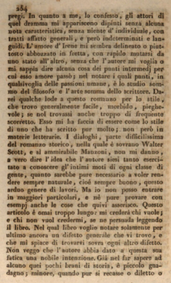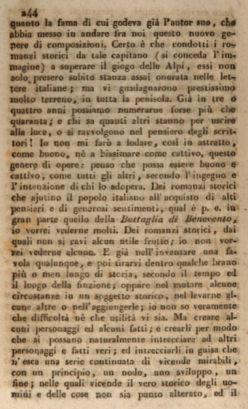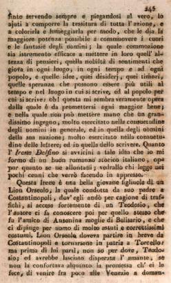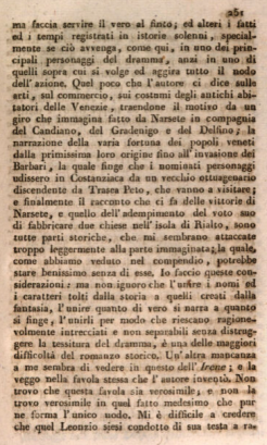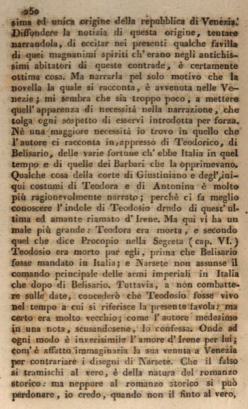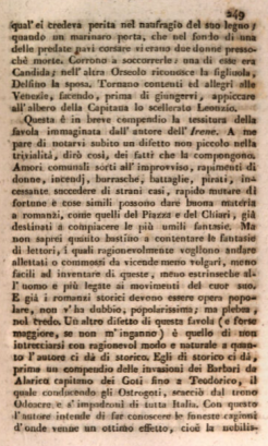 Questa è in breve compendio la tessitura della favola immaginata dall'autore dell'Irene. A me pare di notarvi subito un difetto non piccolo nella trivialità, dirò così, dei fatti che la compongono. Amori comunali sorti all'improvviso, rapimenti di donne, incendj, burrasche, battaglie, pirati, incessante succedere di strani casi, rapido mutare di fortune e cose simili possono dare buona materia a romanzi, come quelli del Piazza e del Chiari, già destinati a compiacere le più umili fantasie. Ma non saprei quanto bastino a contentare le fantasie di lettori, i quali ragionevolmente vogliono andare allettati o commossi da vicende meno volgari, meno facili ad inventare di queste, meno estrinseche all'uomo e più legate ai movimenti del cuor suo. E già i romanzi storici devono essere opera popolare, non v'ha dubbio, popolarissima; ma plebea, nol credo. Un altro difetto di questa favola (e forse maggiore, se non m'inganno) è quello di non intrecciarsi con ragionevol modo e naturale a quanto l'autore ci dà di storico. Egli di storico ci dà, prima un compendio delle invasioni dei Barbari da Alarico capitano dei Goti fino a Teodorico, il quale conducendo gli Ostrogoti, scacciò dal trono Odoacre e s'impadronì di tutta Italia. Con questo l'autore intende di far conoscere le funeste cagioni d'onde venne un ottimo effetto, cioè la nobilissima ed unica origine della repubblica di Venezia. Diffondere la notizia di questa origine, tentare narrandola, di eccitar nei presenti qualche favilla di quei magnanimi spiriti ch'erano negli antichissimi abitatori di queste contrade, è certamente ottima cosa. Ma narrarla pel solo motivo che la novella la quale si racconta, è avvenuta nelle Venezie; mi sembra che sia troppo poco, a mettere quell'apparenza di necessità nella narrazione, che tolga ogni sospetto di esservi introdotta per forza. Nè una maggiore necessità io trovo in quello che l'autore ci racconta in appresso di Teodorico, di Belisario, delle varie fortune ch'ebbe Italia in quel tempo e di quelle dei Barbari che la opprimevano. Qualche cosa della corte di Giustiniano e degl'iniqui costumi di Teodora e di Antonina è molto più ragionevolmente narrato; perchè ci fa meglio conoscere l'indole di Teodosio drudo di quest'ultima ed amante riamato d'Irene. Ma qui vi ha un male più grande: Teodora era morta, e secondo quel che dice Procopio nella Segreta (cap. VI.) Teodosio era morto pur egli, prima che Belisario fosse mandato in Italia; e Narsete non assunse il comando principale delle armi imperiali in Italia che dopo di Belisario. Tuttavia, a non combattere sulle date, concederò che Teodosio fosse vivo nel tempo a cui si riferisce la presente favola: ma certo era molto vecchio; come l'autore medesimo in una nota, scusandosene, lo confessa. Onde ad ogni modo è inverisimile l'amore d'Irene per lui; com'è affatto immaginaria la sua venuta a Venezia per contrariare i disegni di Narsete. Che il falso si tramischi al vero, è della natura del romanzo storico: ma neppure al romanzo storico si può perdonare, io credo, quando non il finto al vero, ma faccia servire il vero al finto; ed alteri i fatti ed i tempi registrati in istorie solenni, specialmente se ciò avvenga, come qui, in uno dei principali personaggi del dramma, anzi in uno di quelli sopra cui si volge ed aggira tutto il nodo dell'azione. Quel poco che l'autore ci dice sulle arti, sul commercio, sui costumi degli antichi abitatori delle Venezie, traendone il motivo da un giro che immagina fatto da Narsete in compagnia del Candiano, del Gradenigo e del Delfino; la narrazione della varia fortuna dei popoli veneti dalla primissima loro origine fino all'invasione dei Barbari, la quale finge che i nominati personaggi udissero in Costanziaca da un vecchio ottuagenario discendente da Trasea Peto, che vanno a visitare; e finalmente il racconto che ci fa delle vittorie di Narsete, e quello dell'adempimento del voto suo di fabbricare due chiese nell'isola di Rialto, sono tutte parti storiche, che mi sembrano attaccate troppo leggermente alla parte immaginata; la quale, come abbiamo veduto nel compendio, potrebbe stare benissimo senza di esse. Io faccio queste considerazioni: ma non ignoro che l'unire i nomi ed i caratteri tolti dalla storia a quelli creati dalla fantasia, l'unire quanto di vero si narra a quanto si finge, l'unirli per modo che riescano ragionevolmente intrecciati e non separabili senza distruggere la tessitura del dramma, è una delle maggiori difficoltà del romanzo storico. [...]