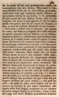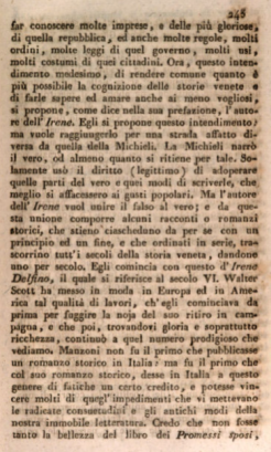 [...] Ora, questo intendimento medesimo, di rendere comune quanto è più possibile la cognizione delle storie venete e di farle sapere ed amare anche ai meno vogliosi, si propone, come dice nella sua prefazione, l'autore dell'Irene. Egli si propone questo intendimento: ma vuole raggiungerlo per una strada affatto diversa da quella della Michieli. La Michieli narrò il vero, od almeno quanto si ritiene per tale. Solamente usò il diritto (legittimo) di adoperare quelle parti del vero e quei modi di scriverle, che meglio si affacessero ai gusti popolari. Ma l'autore dell'Irene vuol unire il falso al vero; e da questa unione comporre alcuni racconti o romanzi storici, che stieno ciascheduno da per se con un principio ed un fine, e che ordinati in serie, trascorrino tutt'i secoli della storia veneta, dandone uno per secolo. Egli comincia con questo d'Irene Delfino, il quale si riferisce al secolo VI. Walter Scott ha messo in moda in Europa ed in America tal qualità di lavori, ch'egli cominciava da prima per fuggire la noja del suo ritiro in campagna, e che poi, trovandovi gloria e soprattutto ricchezza, continuò a quel numero prodigioso che vediamo. Manzoni non fu il primo che pubblicasse un romanzo storico in Italia: ma fu il primo che col suo romanzo storico, desse in Italia a questo genere di fatiche un certo credito, e potesse vincere molti di quegl'impedimenti che vi mettevano le radicate consuetudini e gli antichi modi della nostra immobile letteratura. Credo che non fosse tanto la bellezza del libro dei Promessi sposi, quanto la fama di cui godeva già l'autor suo, che abbia messo in andare fra noi questo nuovo genere di composizioni. Certo è che condotti i romanzi storici da tale capitano (si conceda l'immagine) a superare il giogo delle Alpi, essi non solo presero subito stanza assai onorata nelle lettere italiane; ma vi guadagnarono prestissimo molto terreno, in tutta la penisola. Già in tre o quattro anni possiamo numerarne forse più che quaranta; e chi sa quanti altri stanno per uscire alla luce, o si ravvolgono nel pensiero degli scrittori! Io non mi farò a lodare, così in astratto, come buono, nè a biasimare come cattivo, questo genere di opere: penso che possa essere buono e cattivo, come tutti gli altri, secondo l'ingegno e l'intenzione di chi lo adopera. Dei romanzi storici che ajutino il popolo italiano all'acquisto di alti pensieri e di generosi sentimenti, qual è p. e. in gran parte quello della Battaglia di Benevento, io vorrei vederne molti. Dei romanzi storici, dai quali non si cavi alcun utile frutto; io non vorrei vederne alcuno. E già nell'inventare una favola qualunque, e poi tirarvi dentro qualche brano più o men lungo di storia, secondo il tempo ed il luogo della finzione; oppure nel mutare alcune circostanze, in un soggetto storico, nel levarne alcune altre o nell'aggiungerle; io non so veramente che difficoltà nè che utilità vi sia. Ma creare alcuni personaggi ed alcuni fatti; e crearli per modo che si possano naturalmente intrecciare ad altri personaggi e fatti veri; ed intrecciarli in guisa che n'esca una serie continuata di vicende mirabili, con un principio, un nodo, uno sviluppo, un fine; nelle quali vicende il vero storico degli uomini e delle cose non sia punto alterato, ed il finto servendo sempre e piegandosi al vero, lo ajuti a comporre la tessitura di tutta l'azione, e a colorirla e lumeggiarla per modo, che le dia la maggiore potenza possibile a commuovere i cuori e le fantasie degli uomini; la quale commozione sia istrumento efficace a mettere in loro quell'altezza di pensieri, quella nobiltà di sentimenti che giova, in ogni luogo, in ogni tempo e ad ogni popolo, e quelle idee, quei desiderj, quei timori, quelle speranze che possono essere più utili al tempo e nel luogo in cui si scrive, ed al popolo per cui si scrive: oh! questa mi sembra veramente opera dalla quale è da promettersi ogni maggior bene; e nella quale non può mettere mano che un grandissimo ingegno, molto esercitato nella consuetudine degli uomini in generale, ed in quella degli uomini della sua nazione; molto esercitato nella consuetudine delle lettere; ed in quella dello scrivere. Quanto l'Irene Delfino si avvicini a tale idea che io mi formo di un buon romanzo storico italiano, oppur pur quanto se ne allontani; vedrallo chi legge nei pochi cenni che verrò facendo in appresso.