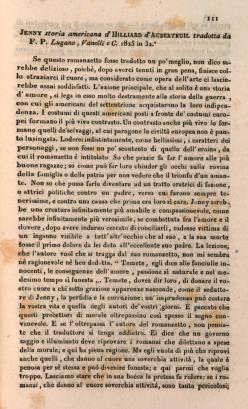 Se questo romanzetto fosse tradotto un po' meglio, non dico sarebbe delizioso, poichè, dopo averci tenuti in gran pena, finisce collo straziarci il cuore, ma considerato come opera dell'arte ci lascierebbe assai soddisfatti. L'azione principale, che al solito è una storia d'amore, si lega in esso molto destramente alla storia della guerra, con cui gli americani del settentrione acquistarono la loro indipendenza. I costumi di questi americani posti a fronte de' costumi europei formano il più vivo contrasto. Un contrasto anche più vivo lo formano quelli de' selvaggi, al cui paragone la civiltà europea non è punto lusingata. Loderei indistintamente, come bellissimi, i caratteri dei personaggi, se non fossi un po' scontento di quello dell'eroina, da cui il romanzetto è intitolato. So che pazzie fa far l'amore alle più buone ragazze; so come può far loro chiuder gli occhi sulla rovina della famiglia o della patria per non vedere che il trionfo d'un amante. Non so che possa farle diventare ad un tratto oratrici di fazione, o attrici politiche contro un padre, verso cui furono sempre tenerissime, e contro una causa che prima era loro sì cara. Jenny sarebbe una creatura infinitamente più amabile e compassionevole, come sarebbe infinitamente più verosimile, se combattuta fra l'amore e il dovere, dopo avere indarno cercato di conciliarli, cadesse vittima di un inganno visibile a tutt'altr'occhio che al suo, e la sua morte fosse il primo dolore da lei dato all'eccellente suo padre. La lezione che l'autore vuol che si tragga dal suo romanzetto, non mi sembra nè ragionevole nè ben dedotta. "Temete, egli dice alle fanciulle innocenti, le conseguenze dell'amore, passione sì naturale e nel medesimo tempo sì funesta". Temete, dovea dir loro, di donare il vostro cuore a chi sotto graziose apparenze nasconde, come il seduttore di Jenny, la perfidia e la corruzione; un'imprudenza può costare la vostra vita e quella degli autori de' vostri giorni. E peccato che questi precettori di morale oltrepassino così spesso il segno convenevole. E se l'oltrepassa l'autore del romanzetto, non pensiate che il traduttore si tenga addietro. Ei dice che un governo saggio e illuminato deve riprovare i romanzi che dilettano a spese della morale; e qui ha piena ragione. Ma egli vuole di più che riprovi anche quelli, che danno al cuore una soverchia attività, la quale è penosa per sè stessa e può divenire funesta; e qui parmi che voglia troppo. Lasciamo stare che in sua bocca la pretesa fa ridere: se i romanzi, che danno al cuore soverchia attività, sono tanto pericolosi; perchè ha egli tradotto Jenny? — Ma ve ne sono di più pericolosi di questo — Lo credo; ma il pericolo è relativo; e non possono esserne giudici che i soli educatori. Volendo pur dare una sentenza o un consiglio, il traduttore dovea parlare ad essi, e lasciare in pace i governi che hanno troppe altre cure.