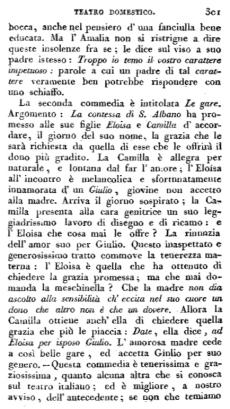 La prima commedia è intitolata La buona sorella. Argomento: Enrico è promesso in isposo ad Amalia: ma Enrico è innamorato di Virginia, sorella dell'Amalia, e Virginia è innamorata di lui: questi amori sono però gelosamente celati nel fondo del loro cuore. Amalia, giovinetta d'acuto intendimento, e affezionatissima alla sorella, s'avvede d'una tale simpatia d'affetti, e con grande generosità d'animo cede alla Virginia lo sposo a se destinato. — Questo semplicissimo soggetto è ingegnosamente trattato dal nostro autore; nondimeno gli amori d'Enrico e della Virginia sono così caldi, le loro smanie così forti, che, ad onta della buona moralità che si trova in questa commedia, potrebbe taluno per avventura non riputarla in tatto consentanea al fine che manifestò l'autore: le presenti composizioni sono evidentemente scritte per la gioventù, anzi per l'acerba gioventù; nè quindi pare che la viva dipintura di amori tanto intensi venga a proposito per quella età: egli è lo stesso che voler ammorzare un nascente incendio collo spirito di vino. Un'altra macchia noi troviamo verso la fine di questa commedia: Amalia, parlando fra se di suo padre, dice Oh Dio! qual carattere intollerante è il suo. Questa è un'insolenza; e sta male, non che nella bocca, anche nel pensiero d'una fanciulla bene educata. Ma l'Amalia non si ristrigne a dire queste insolenze fra se; le dice sul viso a suo padre istesso: Troppo io temo il vostro carattere impetuoso: parole a cui un padre di tal carattere veramente ben potrebbe rispondere con uno schiaffo.