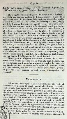 Che il sig. Gio. Giacomo Regnault de Warin e tanti altri scrittori della sua nazione abbiano il dilicato piacere, degno della bell'anima loro, di descrivere delle scelleratezze, delle atrocità, dei delitti... non c'è da farsene le meraviglie: ma che il sig. Gio. Giacomo Regnault de Warin, come tanti altri scrittori della sua nazione inventino de' Romanzi atroci per ingiuriare e per calunniare l'Italia, che forse mai non videro, e gl'Italiani cui forse non ebbero mai la gloria di conoscere; e che il sig. Gio. Giacomo Regnault de Warin faccia dire ad una Italiana, a carte 31 della sua Caverna degli Strozzi: Entrambi eravamo giovani amanti, ITALIANI. Perdoniamoci scambievolmente i delitti delle circostanze e del clima: questo è il colmo dell'imprudenza. Ah, il mio sig. Gio. Giacomo Regnault de Warin, se volete descrivere dei delitti, rivolgete l'occhio sulla patria vostra, e può darsi che vi troviate da stancare la vostra penna infernale con racconti di fatti barbari ed atroci, e de' materiali da fare de' romanzi meno incongruenti, meno insulsi, meno assurdi e più diabolici della Caverna degli Strozzi, che ha destata l'indignazione de' buoni Italiani.