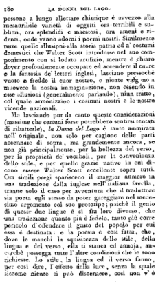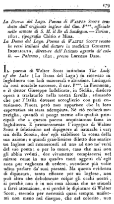 Il poema di Walter Scott intitolato The Lady of the Lake (La Dama del Lago) fu ricevuto in Inghilterra con lodi universali e altissime. Lusingati da così notabile successo, il cav. P*** in Piemonte, e il dottor Giuseppe Indelicato, in Sicilia, diedero opera a traslatarlo nella nostra favella, stimando che pur l'Italia dovesse accoglierlo con pari entusiasmo. Finora però non apparisce che la loro aspettativa sia stata adempiuta. Nè ciò recherà meraviglia, quando si ponga mente alle qualità principali che a questo poema acquistarono fama in Inghilterra. E primieramente l'ingegno di Walter Scott è felicissimo nel dipignere al naturale i varj siti della Scozia, dov'egli stabilisce la scena della sua azione; e quindi grandissimo diletto dee sentire un Inglese nel riconoscersi ad uno ad uno ne' versi del suo poeta; o per lo meno, caso che mai non gli abbia veduti, dee vivamente compiacersi nel mirare come in un quadro tanti oggetti ch'egli avea pur vaghezza di vedere, avendone più volte udito parlare da' suoi paesani. Ma questa evidenza di dipintura, tanto efficace per un Inglese, non può altro che debolmente colpir gli occhi nostri, sì perchè non è in noi cosa alcuna che ne stimoli a farvi attenzione, e sì perchè le dipinture di Walter Scott, essendo per necessità quasi sempre uniformi non meno nel disegno, che nel colorito, non possono a lungo allettare chiunque è avvezzo alla inesauribile varietà di oggetti ora terribili e sublimi, ora splendidi e maestosi, ora ameni e ridenti, onde vanno adorni i poemi nostri. Similmente tutte quelle allusioni alla storia patria ed a' costumi domestici che Walter Scott introdusse nel suo componimento con sì lodato artifizio, mentre è chiaro dover profondamente occupare ed accendere il cuore e la fantasia de' lettori inglesi, lasciano pressochè vuoto e freddo il cuor nostro, e niente valgono a muovere la nostra immaginazione, non essendo in esse allusioni (generalmente parlando), niun tratto, col quale armonizzino i costumi nostri e le nostre vicende nazionali.