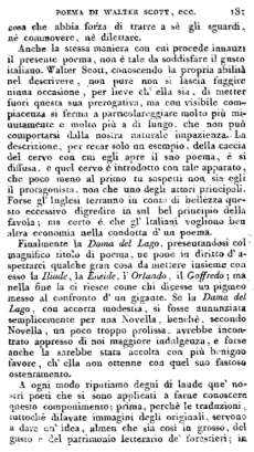 Anche la stessa maniera con cui procede innanzi il presente poema, non è tale da soddisfare il gusto italiano. Walter Scott, conoscendo la propria abilità nel descrivere, non pure non si lascia fuggire niuna occasione, per lieve ch'ella sia, di metter fuori questa sua prerogativa, ma con visibile compiacenza si ferma a particolareggiare molto più minutamente e molto più a di lungo che non può comportarsi dalla nostra naturale impazienza. La descrizione, per recar solo un esempio, della caccia del cervo con cui egli apre il suo poema, è sì diffusa, e quel cervo è introdotto con tale apparato, che poco meno al primo tu sospetti non sia egli il protagonista, non che uno degli attori principali. Forse gl'Inglesi terranno in conto di bellezza questo eccessivo digredire in sul bel principio della favola; ma certo è che gl'Italiani vogliono ben altra economia nella condotta d'un poema.