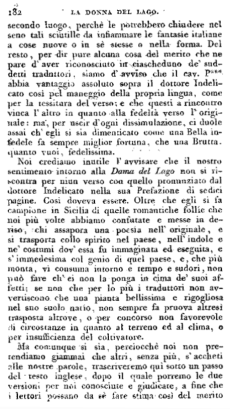 Noi crediamo inutile l'avvisare che il nostro sentimento intorno alla Dama del Lago non si riscontra per niun verso con quello pronunziato dal dottore Indelicato nella sua Prefazione di sedici pagine. Così doveva essere. Oltre che egli si fa campione in Sicilia di quelle romantiche follie che noi più volte abbiamo confutate e messe in deriso, chi assapora una poesia nell'originale, e si trasporta collo spirito nel paese, nell'indole e ne' costumi dov'essa fu immaginata ed eseguita, e s'immedesima col genio di quel paese, e, che più monta, vi consuma intorno e tempo e sudori, non può fare ch'ei non la ponga in cima de' suoi affetti; se non che per lo più i traduttori non avvertiscono che una pianta bellissima e rigogliosa nel suo suolo natio, non sempre fa prova altresì trasposta altrove, o per concorso non favorevole di circostanze in quanto al terreno ed al clima, o per insufficienza del coltivatore.